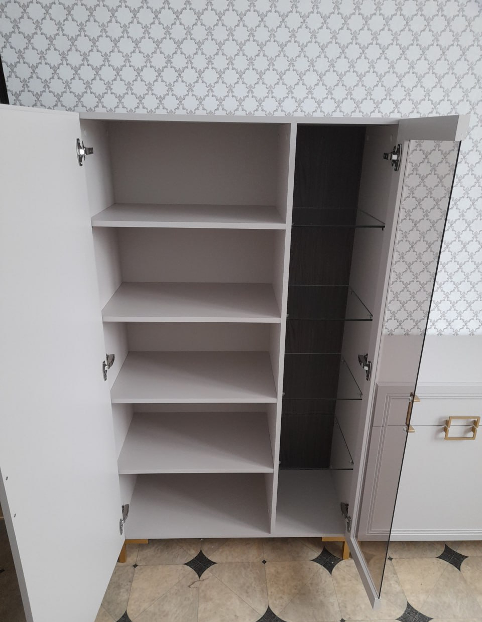 • Внутреннее наполнение: 4 стеклополки 6 мм за стеклянным фасадом, и 4 полки ЛДСП 16 мм — за глухим;